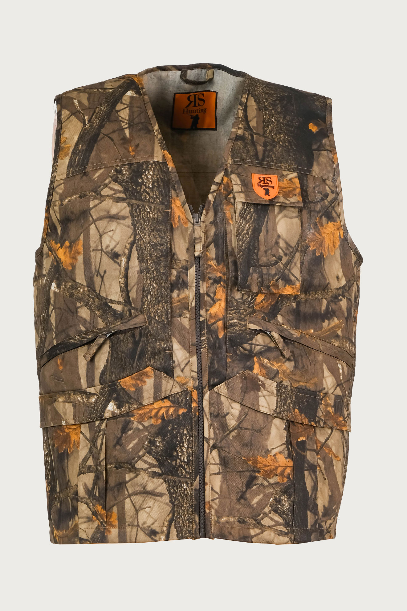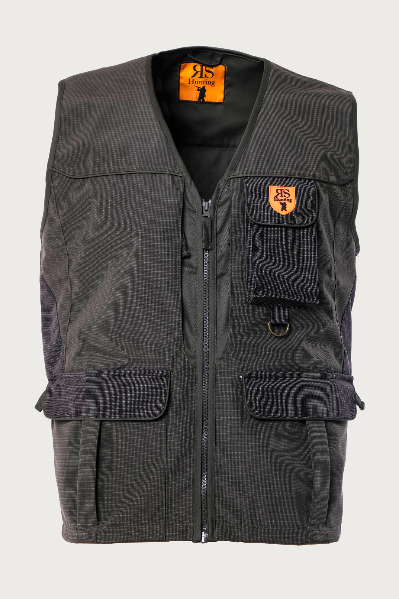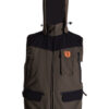 Gilet in tessuto rip-stop elasticizzato verde con profilo arancio fluo. Idrorepellente con cappuccio staccabile con zip tasca porta palmare 2 tasche sul dorso di 20 cm con zip 2 tasche al fondo con patta fluorescente estraibile e con zip, una tasca interna e carniere grande con 2 zip.