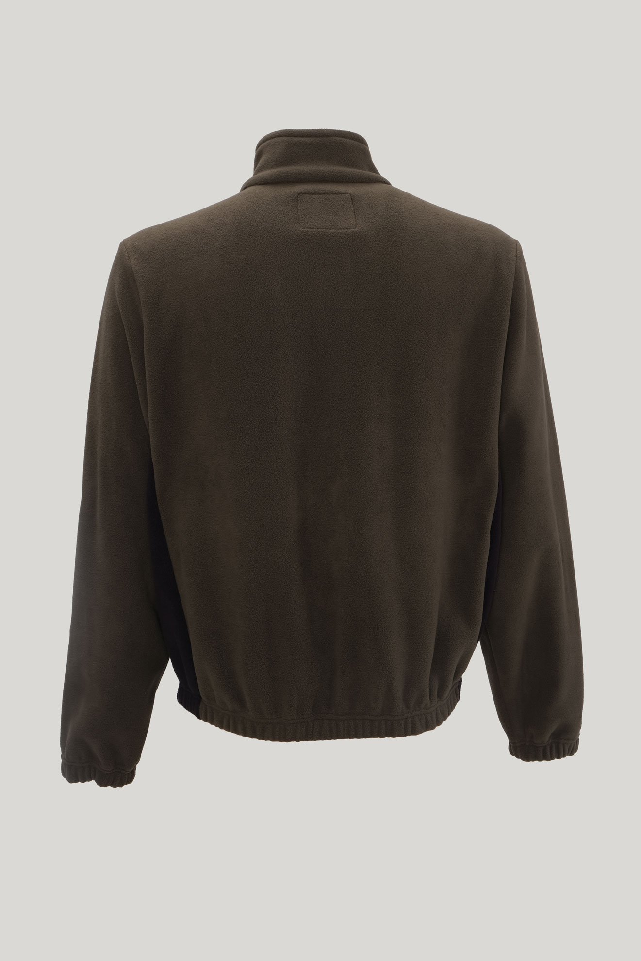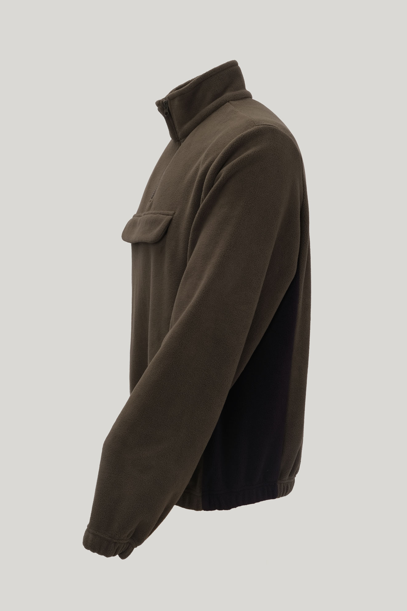 Felpa pile verde con fianchi in nero, tascone sul petto con chiusura a zip e copri zip. Elastico al fondo e sui polsini. Collo alto e apertura anteriore a mezza zip.