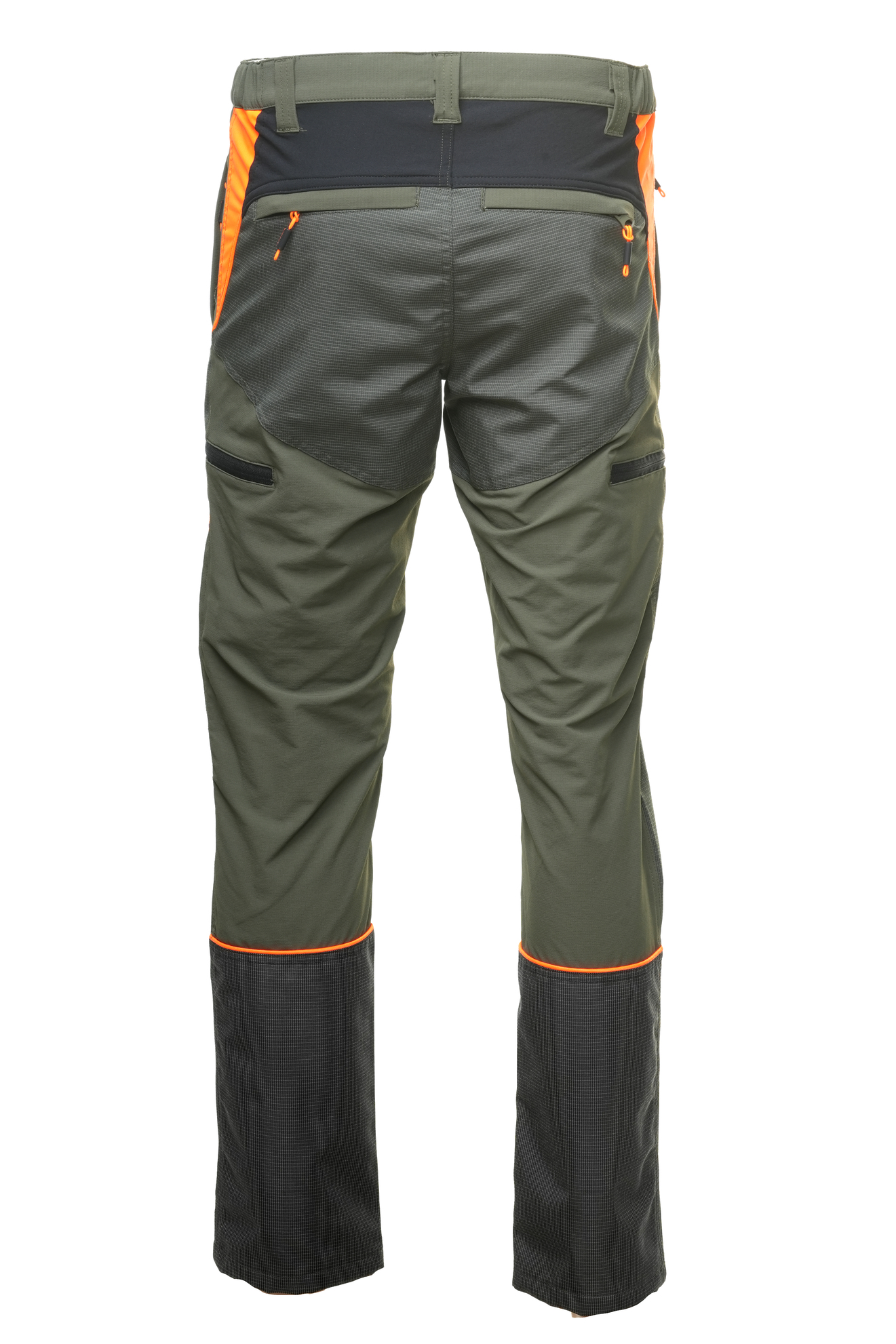 Pantalone in tessuto rip-stop elasticizzato idrorepellente con protezioni in tessuto tecnico sulle ginocchia sul sedere e sul fondo gamba, 2 tasche frontali con zip 2 tasconi a taglio con zip 2 tasche dietro con zip.
