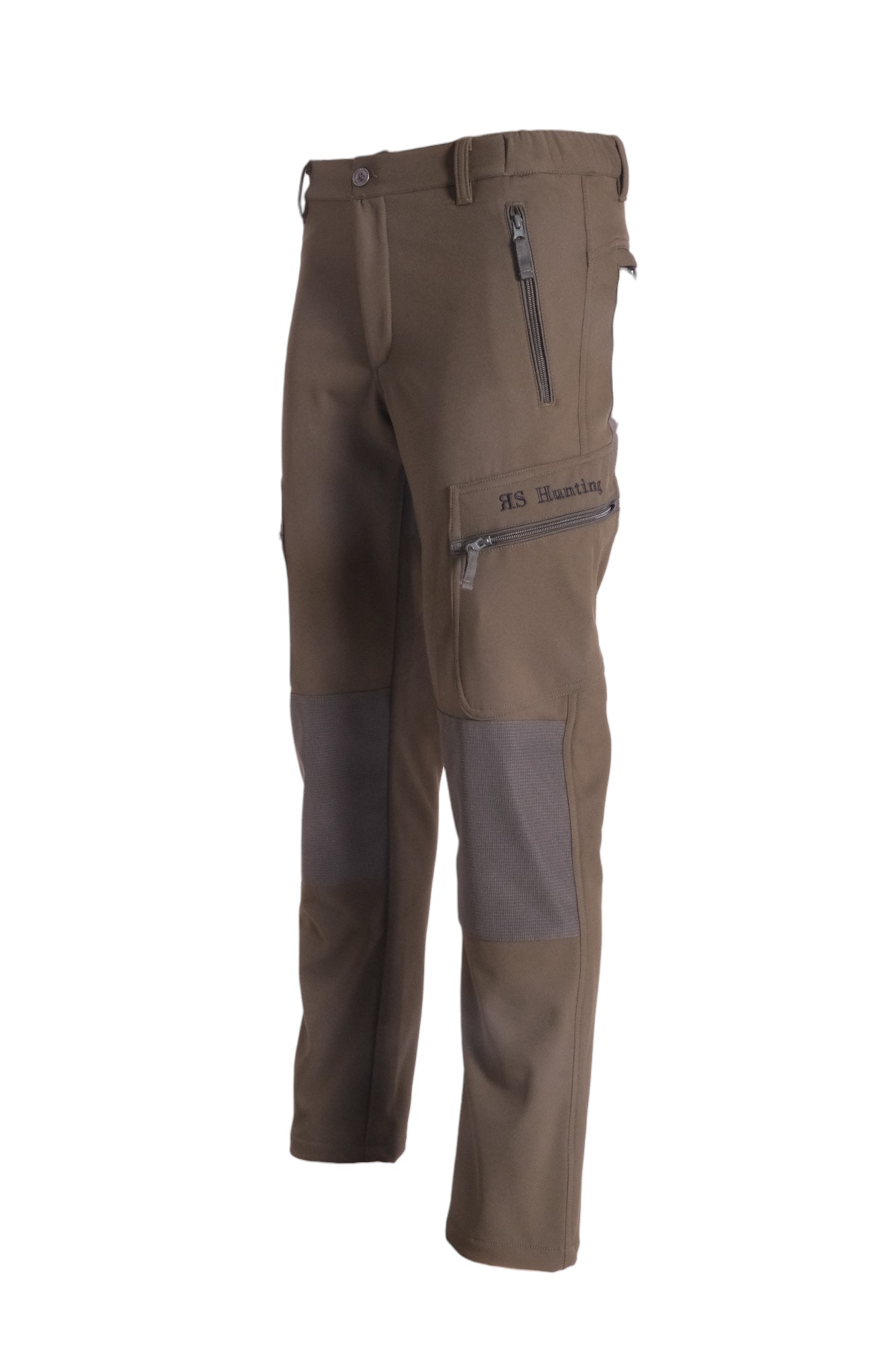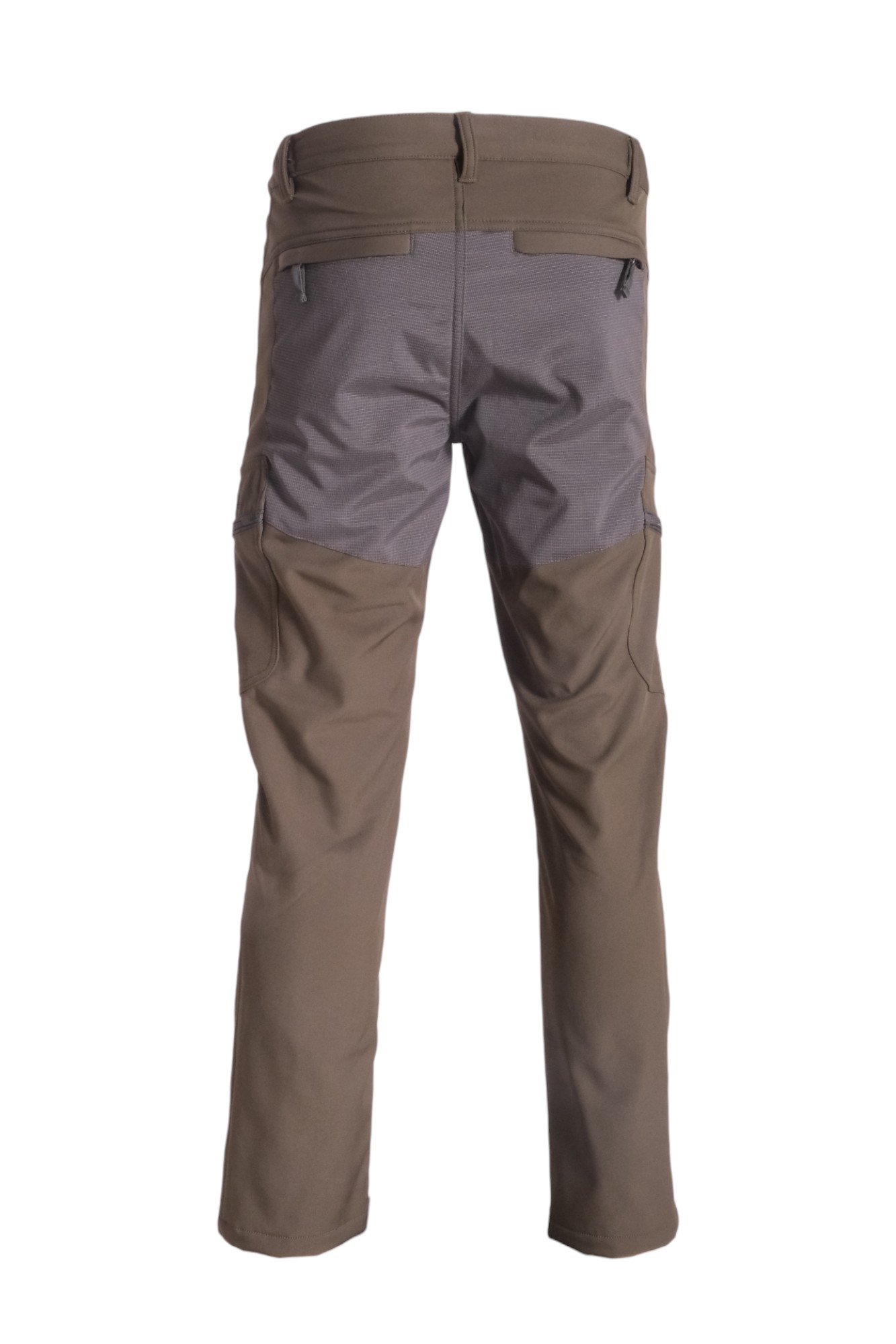 Pantalone in tessuto elasticizzato softshell leggero idrorepellente con 2 tasche frontali con zip 2 tasconi grandi con patta e zip protezioni in tassuto tecnico sul sedere e sulle ginocchia